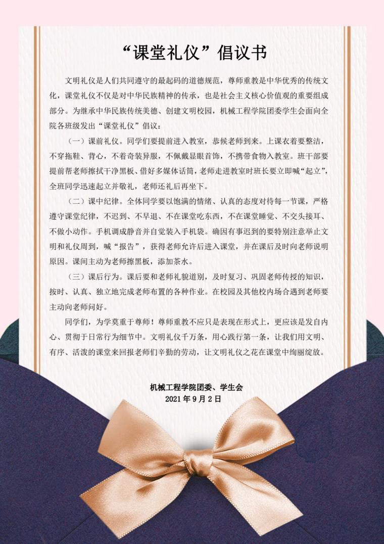 新学期第一天、第37个教师节来临之际,为弘扬尊师重教传统美德、传承中华民族文明礼仪,999策略白菜手机论坛团委学生会面向全院各班级发出了“课堂礼仪”倡议书,鼓励全院学生遵守课前礼仪、严守课中纪律、恪守课后行为。倡议受到了同学们的积极响应,在全院内掀起尊师重教、遵守课堂礼仪的热潮。