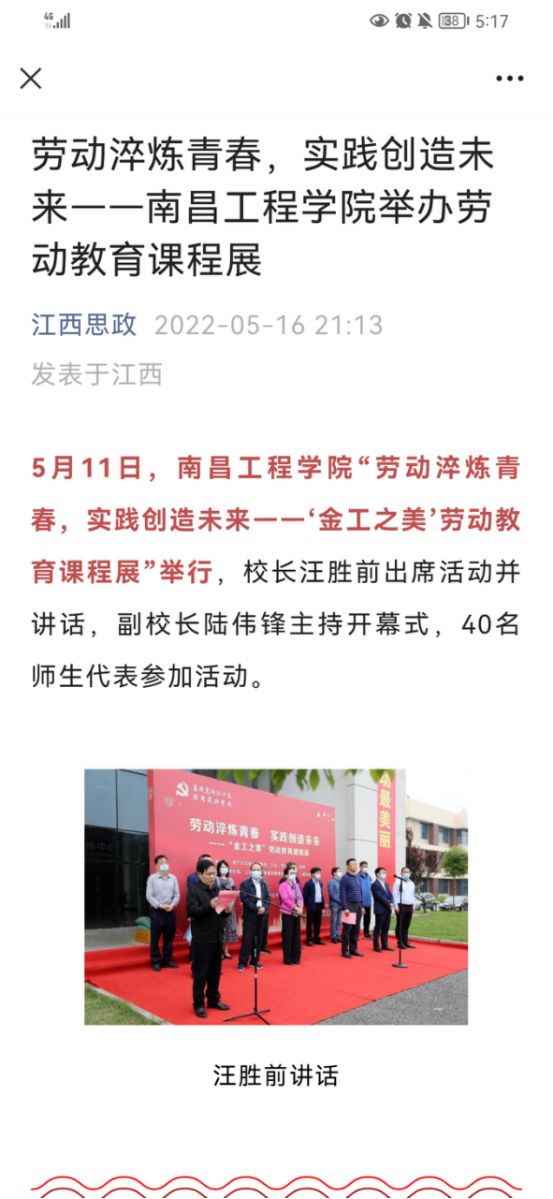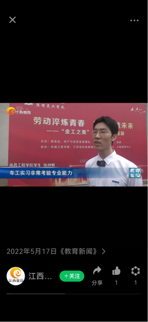 近日,新华社、中新网、人民网、江西教育电视台等主流媒体以《南昌工程学院举办劳动教育课程展》为题,对白菜官网“金工之美”——劳动教育课程展进行报道。