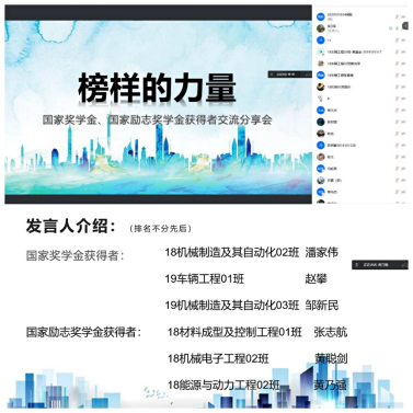 为深入挖掘机械学子中涌现的典型,充分发挥优秀学生的模范带头作用,更好地引导青年学生成长成才,999策略白菜手机论坛于2022年5月9日至5月10日在线上举办了“榜样的力量—国家奖学金、国家励志奖学金获得者交流分享会活动。