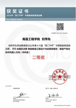 近日教育部2022年第十六届“西门子杯”中国智能制造挑战赛全国总决赛落下帷幕,白菜官网刘萍先老师指导2020级机械电子工程学生陈乐荣获“智能制造工程设计与应用类赛项:智能产线与协作机器人方向(本科组)”全国总决赛二等奖。