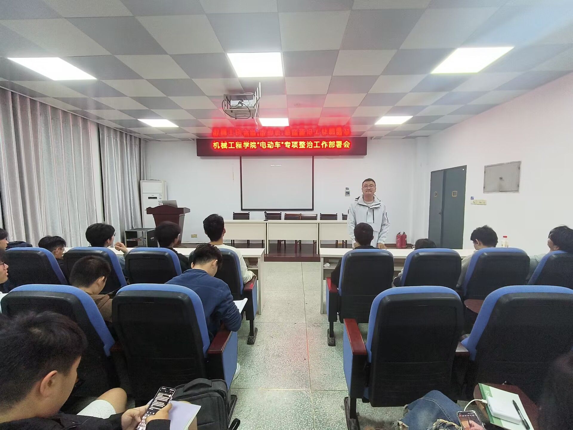 部署会上,主持人向同学们讲解了学校关于“电动车”专项整治工作的政策及要求,并就“电动车”专项整治工作提出三点要求:一是各班级要高度重视,积极配合;二是各班级要大力宣传,积极行动;三是各班级要结合实际,有效整治。