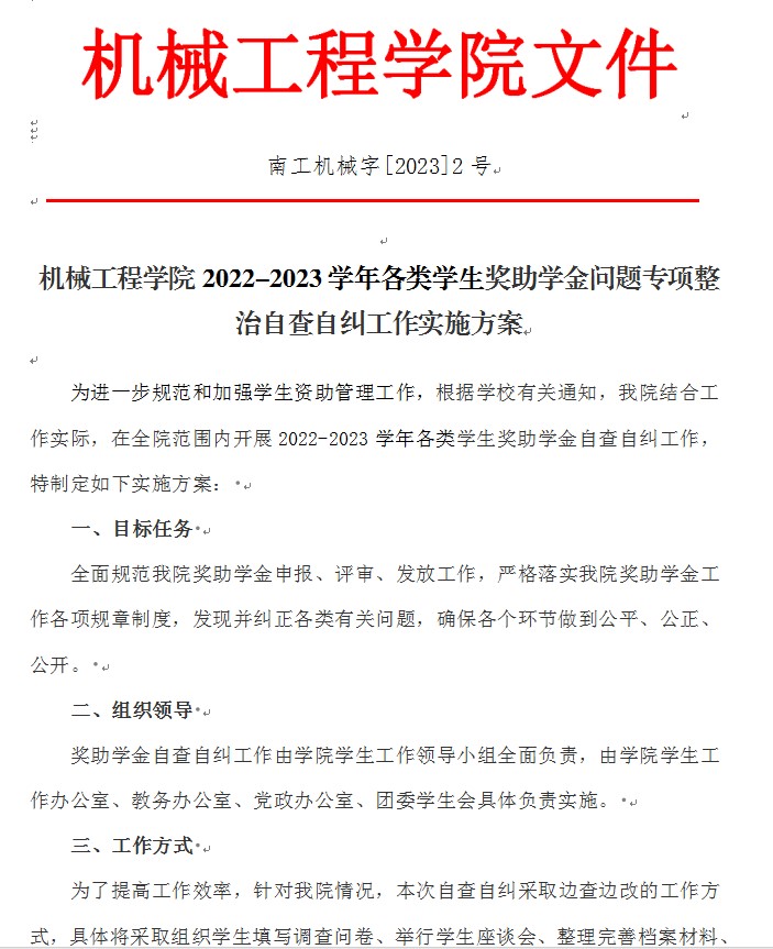 制定一个工作方案。结合工作实际,999策略白菜手机论坛成立专项工作小组,制定并下发了《999策略白菜手机论坛2022-2023学年各类学生奖助学金问题专项整治自查自纠工作实施方案》,确保工作有序、顺利开展。