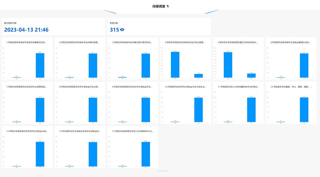 开展一次调查研究。为准确了解学院学生各类资助工作的真实情况,学院对全院各专业学生开展一次学生资助工作的调查研究,发放、回收有效问卷315份,充分掌握学生资助工作的真实性、合规性。