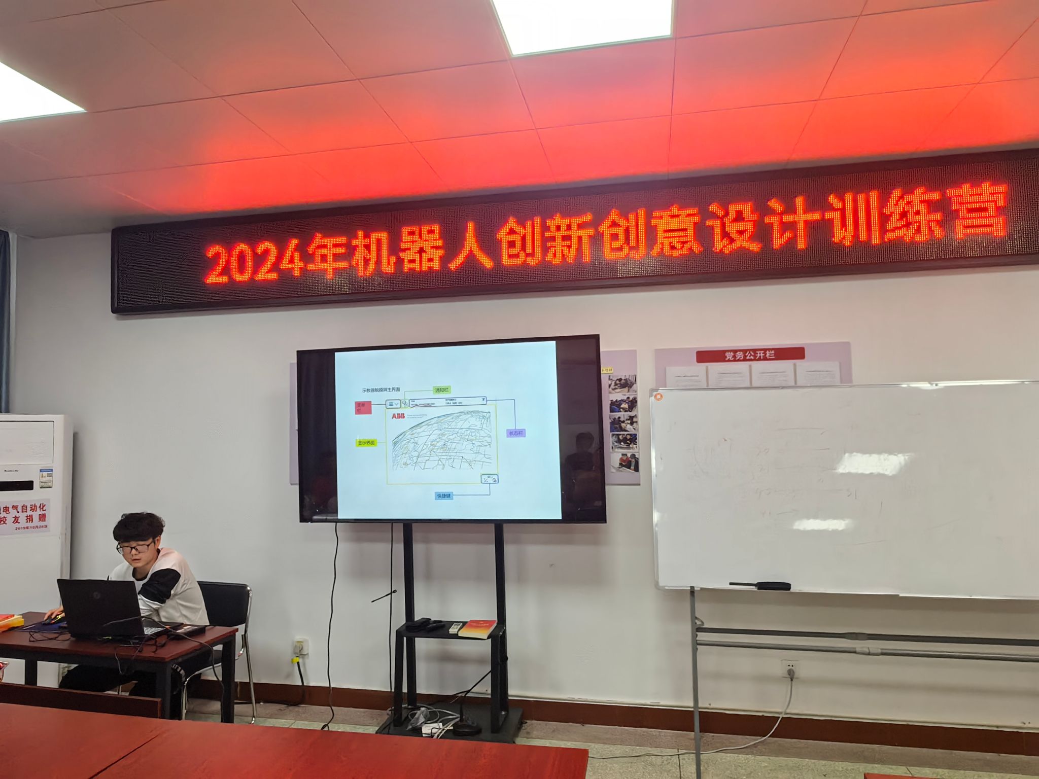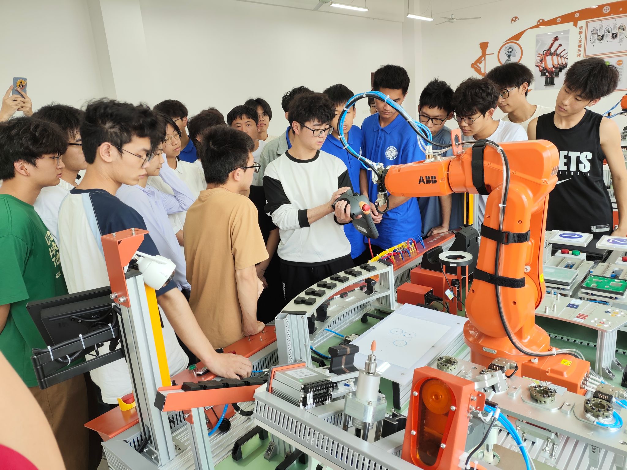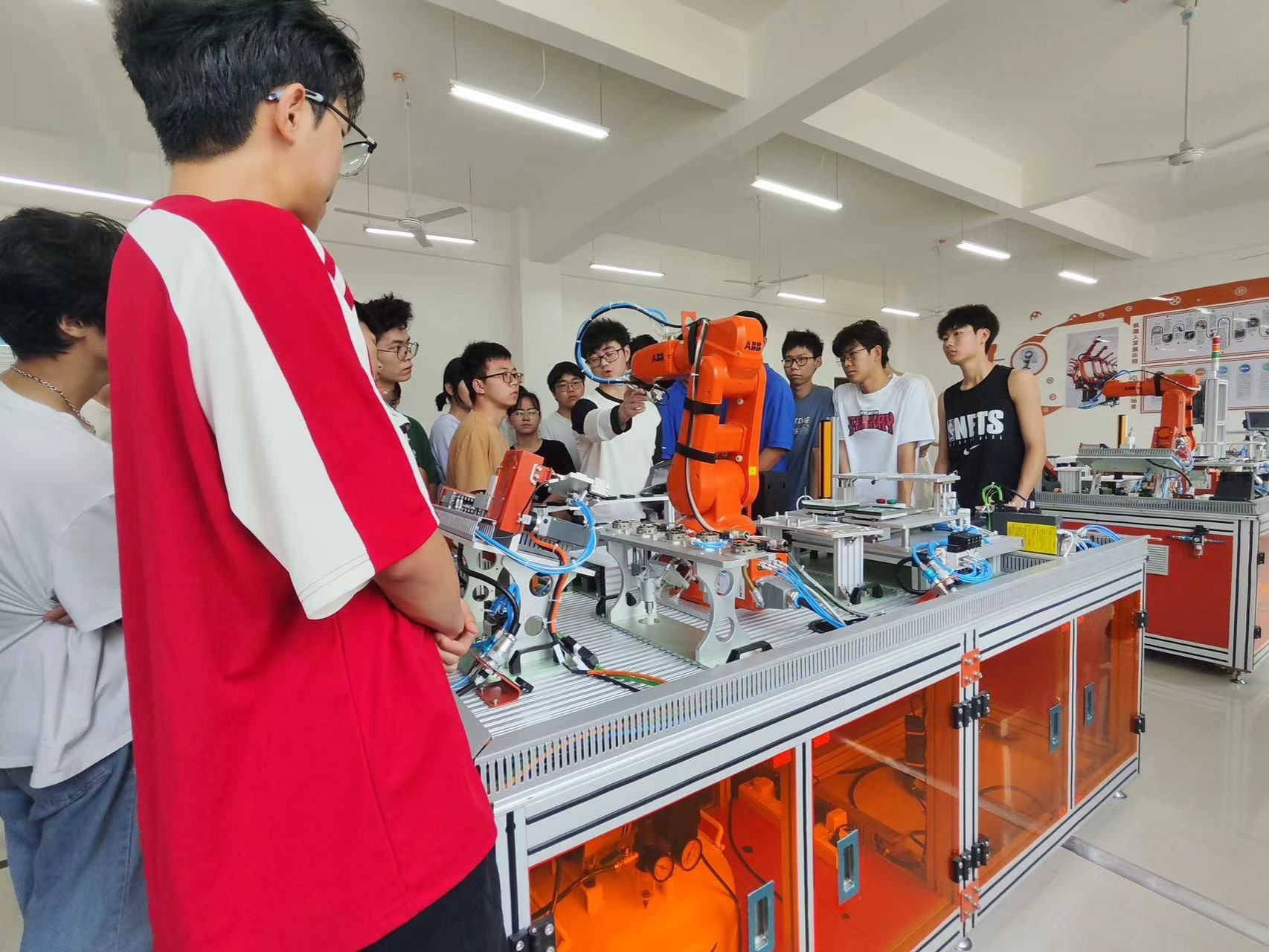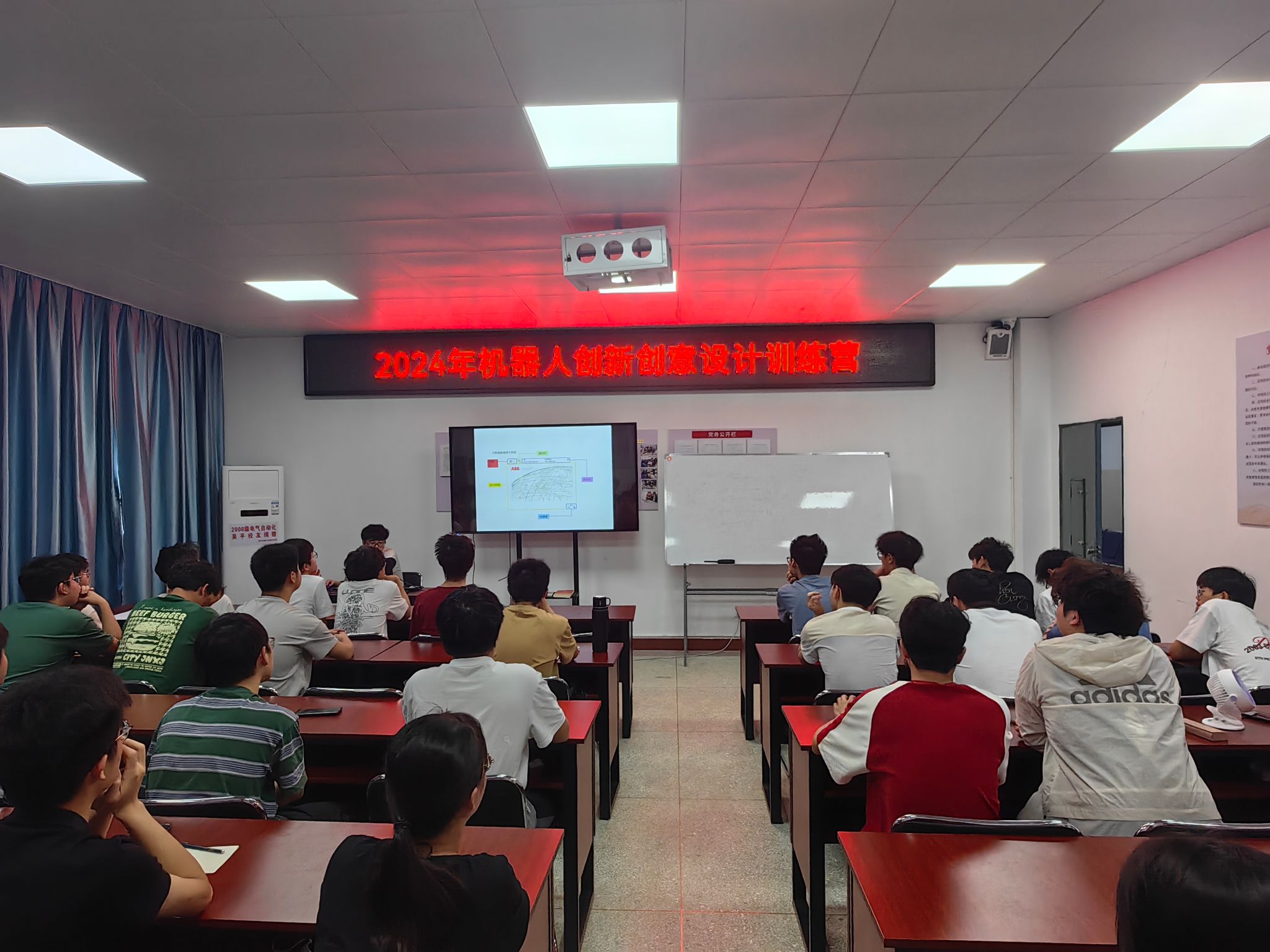 训练营邀请到了北京华航工程师在机电楼A406进行理论讲解,主要讲授了中国高校智能机器人大赛基本规则、机器人基本结构、传感器原理、控制器编程方法等基本内容,并在工程训练中心结合分拣机械臂等实操设备进行演练讲解,寓教于乐,学做一体,调动学生的学习兴趣,提高了同学们在机器人组装、编程及调试方面的工程实践能力。