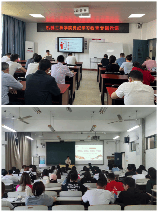 5月13-14日,机械工程学院开展党纪学习教育纪律教育专题党课,学院党委夏志红以“学党纪、知党纪、明党纪、守党纪”为题,在机电楼A406会议室、北教学楼分别为全体师生党员解读新修订的《中国共产党纪律处分条例》。